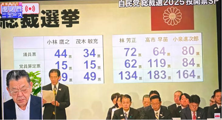 2025年10月4日14時10分確定情報 – 自民党総裁選の第1回投票結果が判明し、**高市早苗氏183票(1位)、小泉進次郎氏164票(2位)**で決選投票に進むことが正式に決定しました。